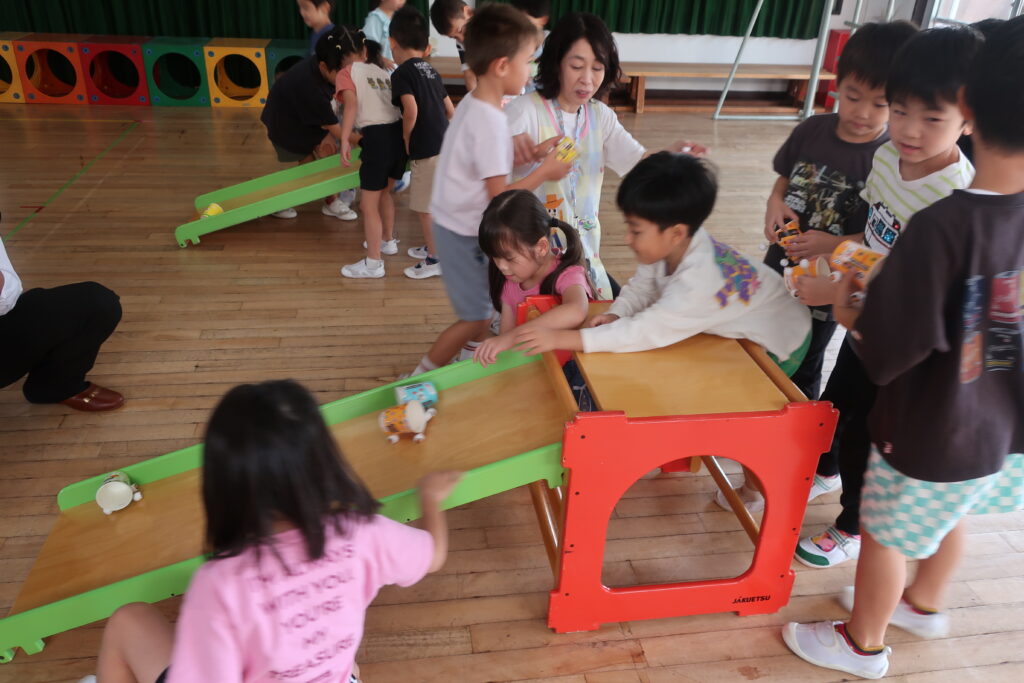 子どもたちは自分で作った車を傾斜で走らせ楽しんだり、園庭でラリーカーに乗せてもらって