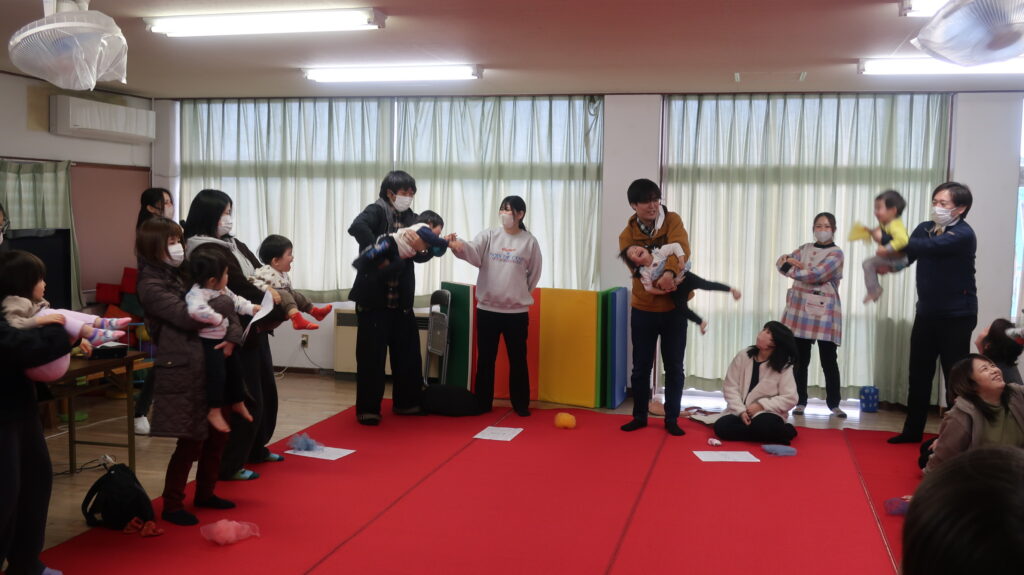 子どもたちの一年間の成長をまとめたビデオを保護者の方々に見ていただきました。親子でわらべうた遊びもしました。